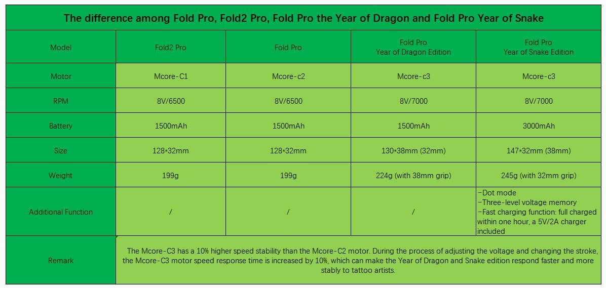 Güçlendirilmiş MCORE3 motor, yüksek pil performansı, yedek batarya ve dot work mode gibi birçok fonksiyonel özellik ile dövme sektöründe mihenk taşı diyebileceğimiz Fold Pro 2025 Edition'ı Year of Snake ile seri dörtlendi ve rüzgarın yönünü değiştirdi.