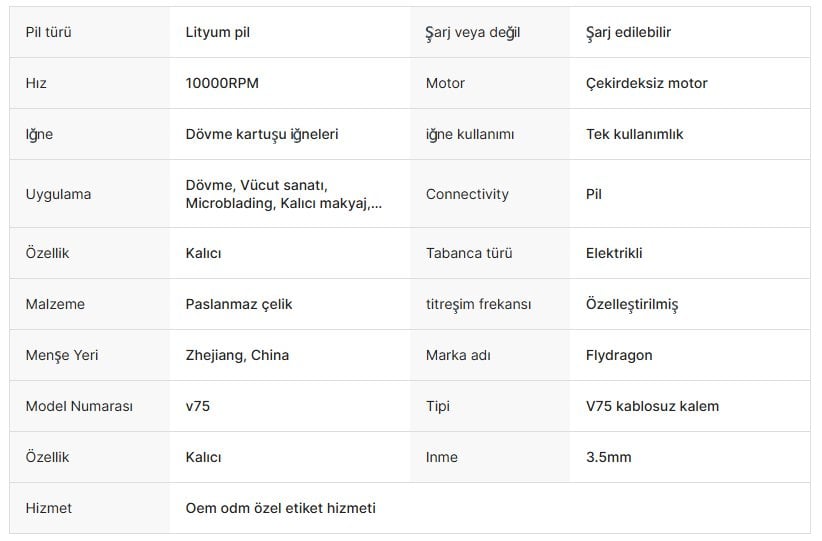 Ergonomik tasarımı ve 167 gr ağırlığı ile el bilek hassasiyetini en üst seviyede tutan, kablosuz, 3.5 mm stroke ve 1500 mAh şarj edilebilir lityum pil ile çalışan siyah renk dövme makinesi